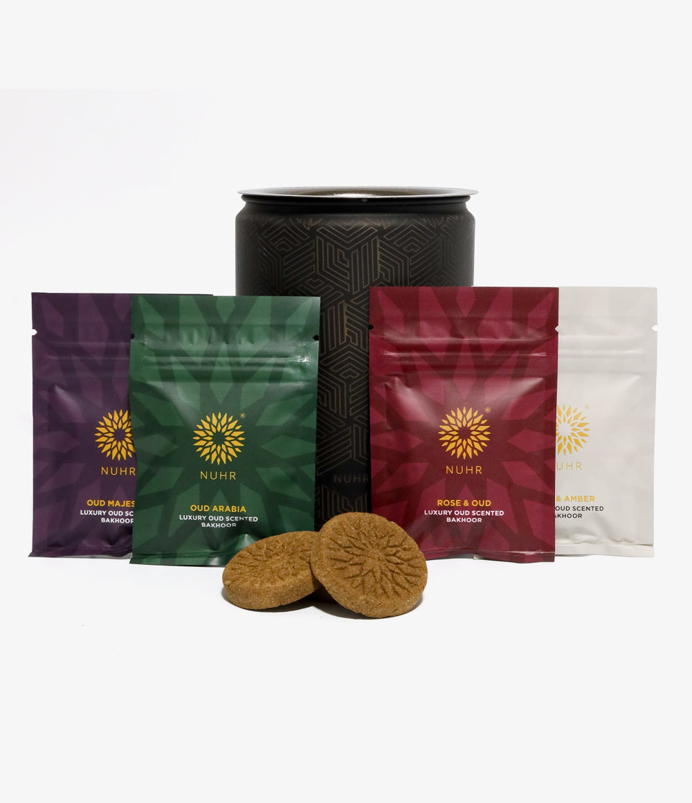 Discover the perfect gift set, complete with a burner and 4 different scented Bakhoor Bricks.